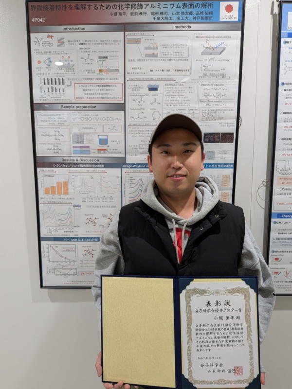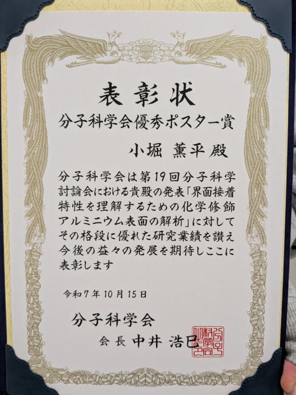 第63回日本接着学会年次大会でM2の小堀薫平君が優秀ポスター賞を受賞しました.2025/07/09