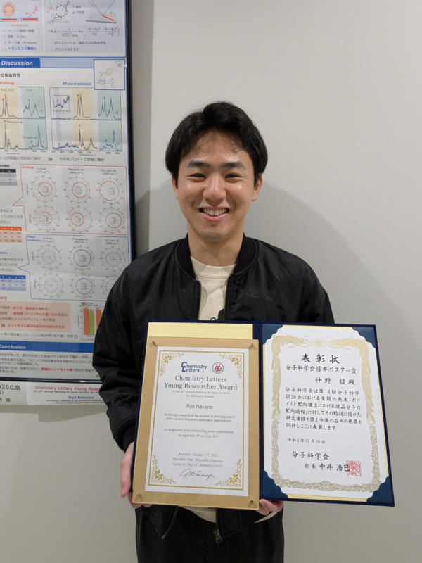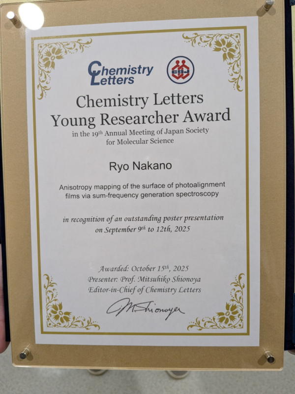 仲野君は分野で最も優秀なポスター発表者に送られる"Chemistry Letters Young Researcher Award"とのダブル受賞です 2025/10/31