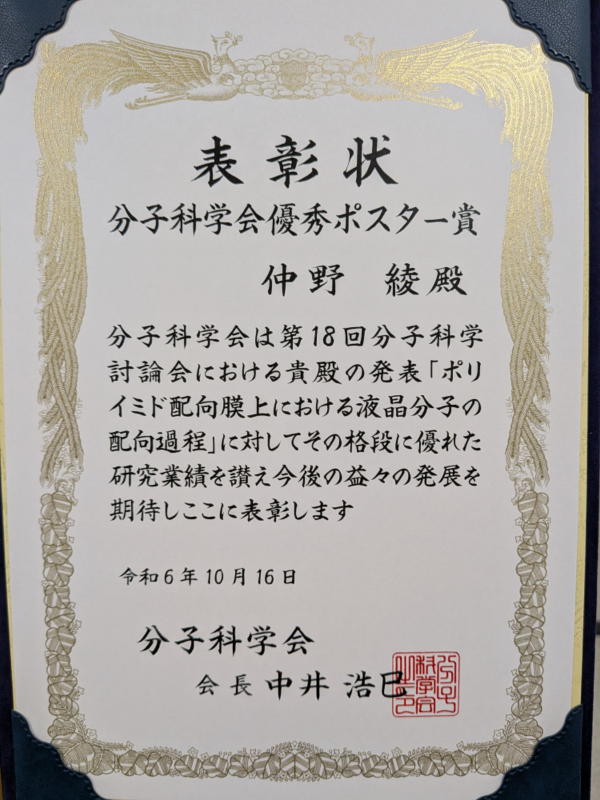 第18回分子科学討論会でM1の仲野綾君が優秀ポスター賞を受賞しました.→第18回分子科学討論会2024優秀ポスター賞 2024/10/25